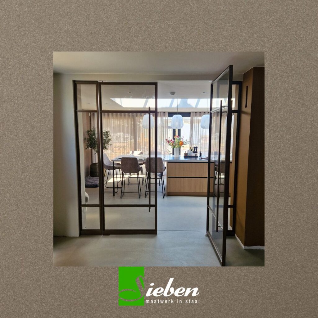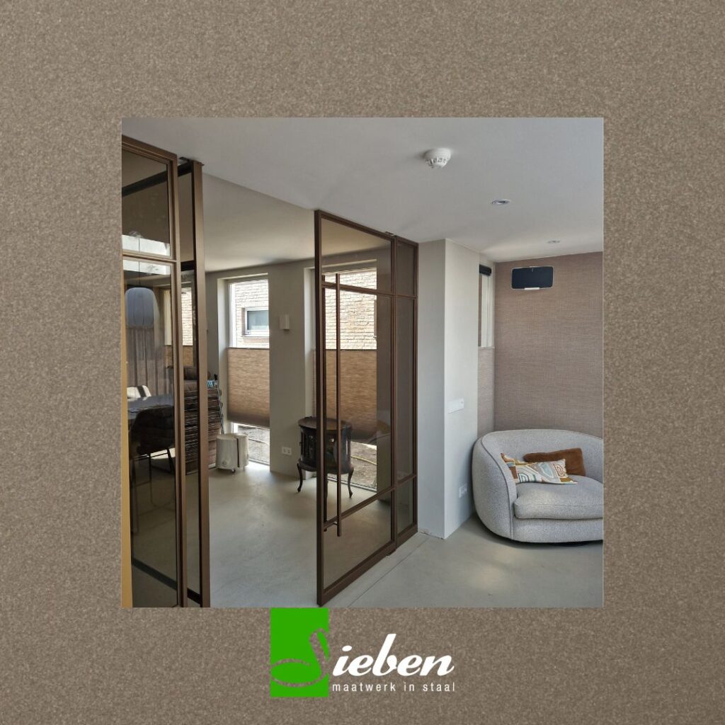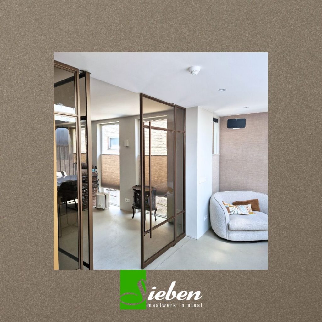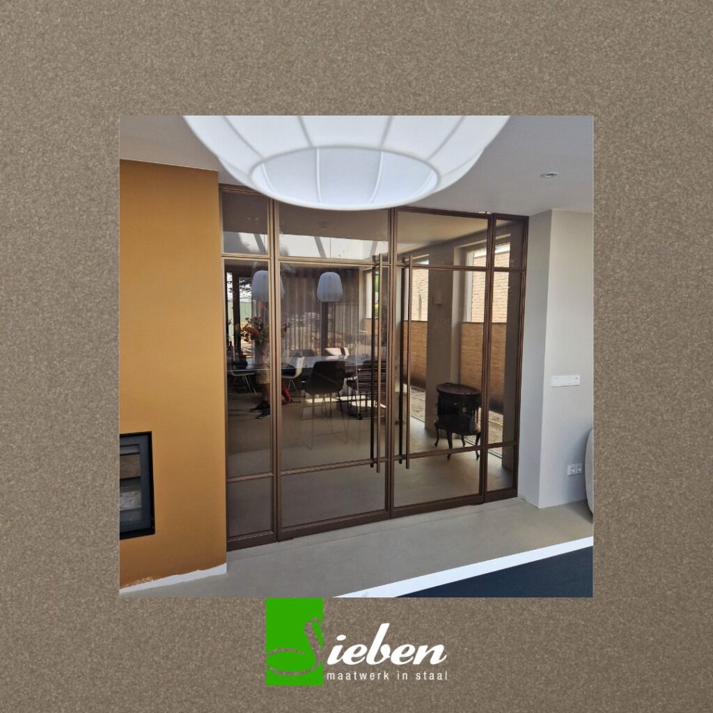 Het interieur van nu wordt vaak gecombineerd met brons en notenhout. Deze dubbele taatsdeuren met zijlichten zorgen voor rust. Niet alleen door het scheiden van de aangrenzende ruimtes. Het brons glas geeft een rustige doorkijk zonder al te veel licht te verliezen.